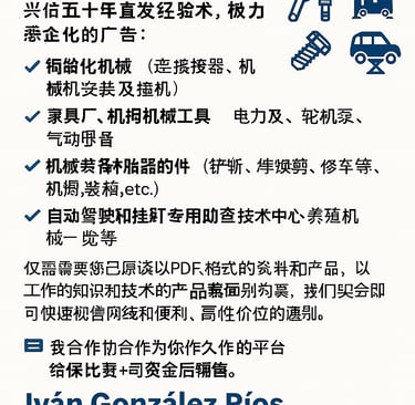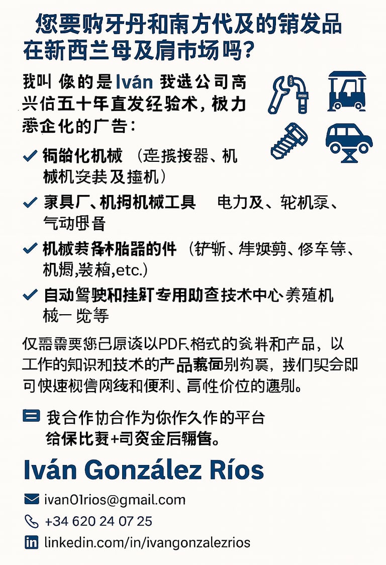 我目前居住在西班牙的加那利群岛,希望向贵公司提供我的服务,不仅可以作为您在西班牙市场的潜在分销商,也可以帮助您建立一个完整的西班牙语线上产品目录,并为每个产品撰写优化的技术描述,以提升销量。同时,我还可以为贵公司开发一个面向西语市场的专业网站,助力您拓展欧洲市场。