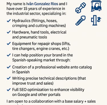 I am confident that with my sector knowledge and language skills, I can help position your products effectively and professionally in Spain.