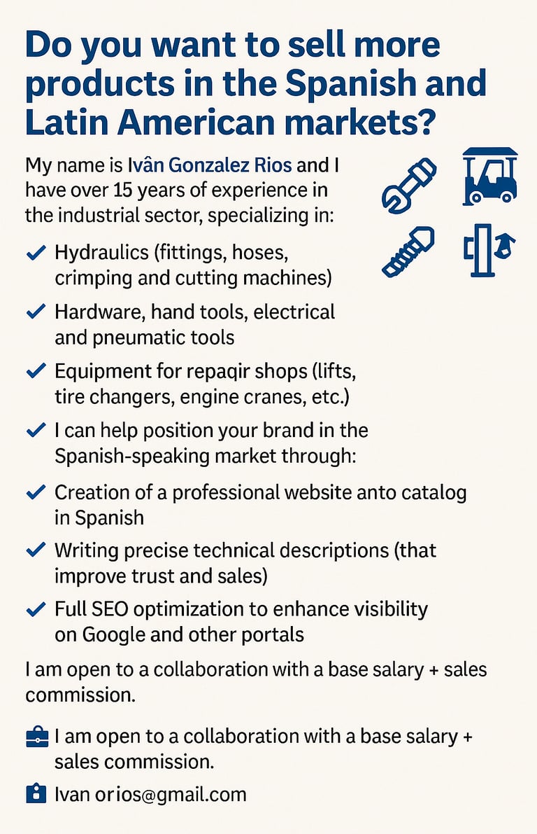 I am currently based in the Canary Islands (Spain), and I would like to offer you my services both as a potential distributor for the Spanish market and as a creator of a complete online catalog in Spanish, with optimized technical descriptions to increase sales. I can also develop a professional website for your brand, adapted to the Spanish-speaking market, helping to grow your presence in Europe.